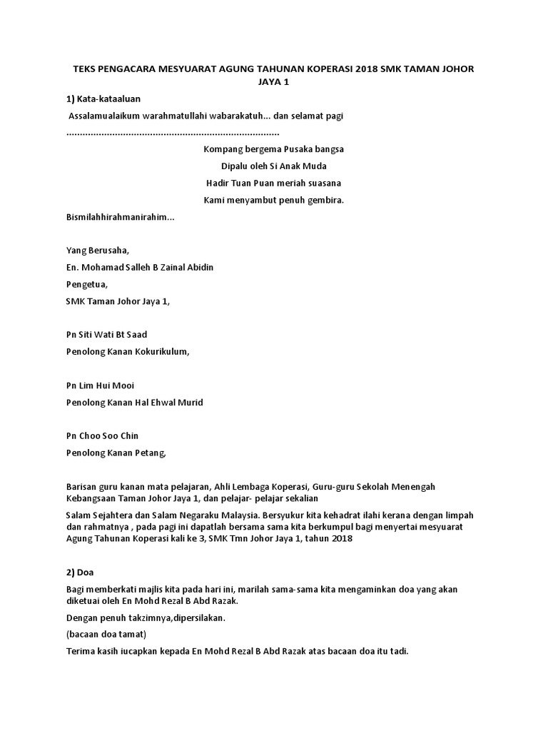 Teks Pengacara Mesyuarat Agung Tahunan Koperasi 2018 Pdf